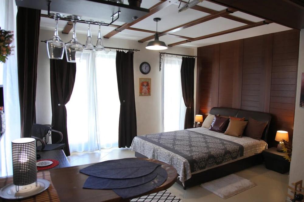 Южная спальня - это уютная, укромная спальня - отделана и меблирована по типу «Шале» - это фактурная штукатурка и каменная плитка в сочетании с деревянными панелями на стенах. Деревянные несущие и декоративные балки на потолках. Мебель, гардероб, барный уголок также отделаны деревом. Отличный вариант для тех, кто любит насыщенные интерьеры.